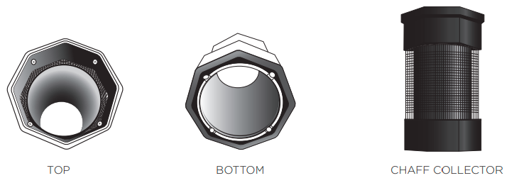 Provjerite je li sakupljač pljeve ispravno okrenut prema gore, poklopac je na mjestu i aluminijski dimnjak je potpuno smješten unutar njega (vidi ilustracije u nastavku). Rad ovog uređaja s sakupljačem pljeve naopako rezultirat će ulaskom pljeve u pržena zrna i prosipanjem po radnoj površini.