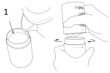Napunite spremnik vode prema riziku. Poravnajte tijelo vašeg MiniPresso s točkom na spremniku i postavite ga na spremnik okretanjem u smjeru kazaljke na satu.